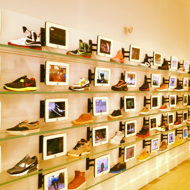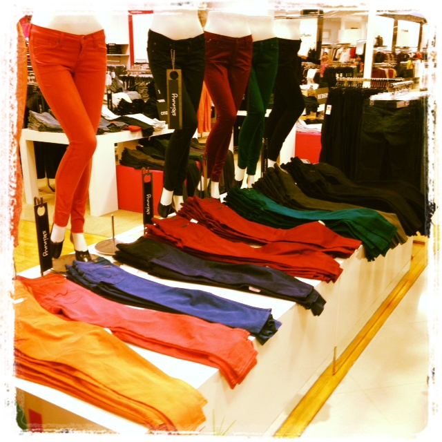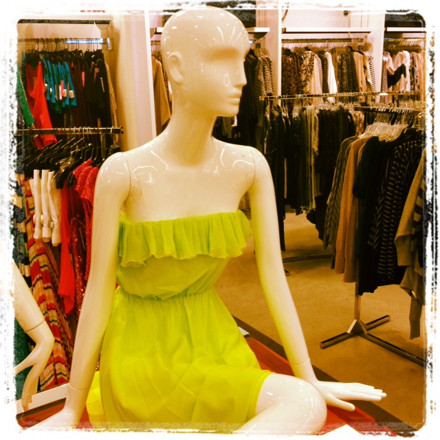 Current trends in department stores include pops of neon colors (see Alice + Olivia frock pictured here), jeans in jewel tones (also photographed) and sales buses galore in both Bloomingdales and Nordstrom stores (yes!). I also stumbled upon just-opened Unknown boutique where the merchandising can be best described as street-meets-tech-chic — check out that plentitude of iPads and Nike kicks. Pretty amaze.
