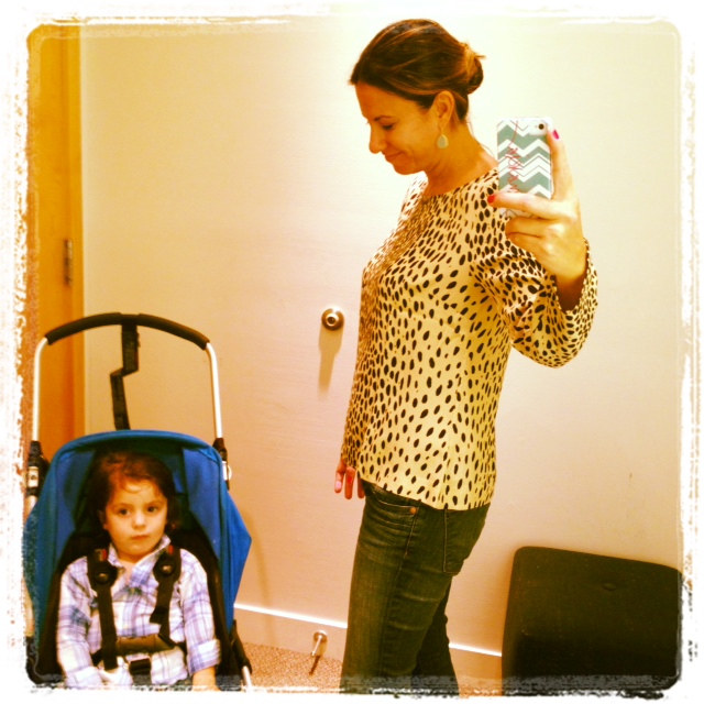 This picture taken in J. Crew summarizes our shopping jaunt quite nicely. Me? I’m happy as a clam trying on this $88 leopard-print top and my son? Well, look at that mug. He’s très ticked off to be in a confined area and not frolicking about the indoor play gym around the corner. Boo hoo.
