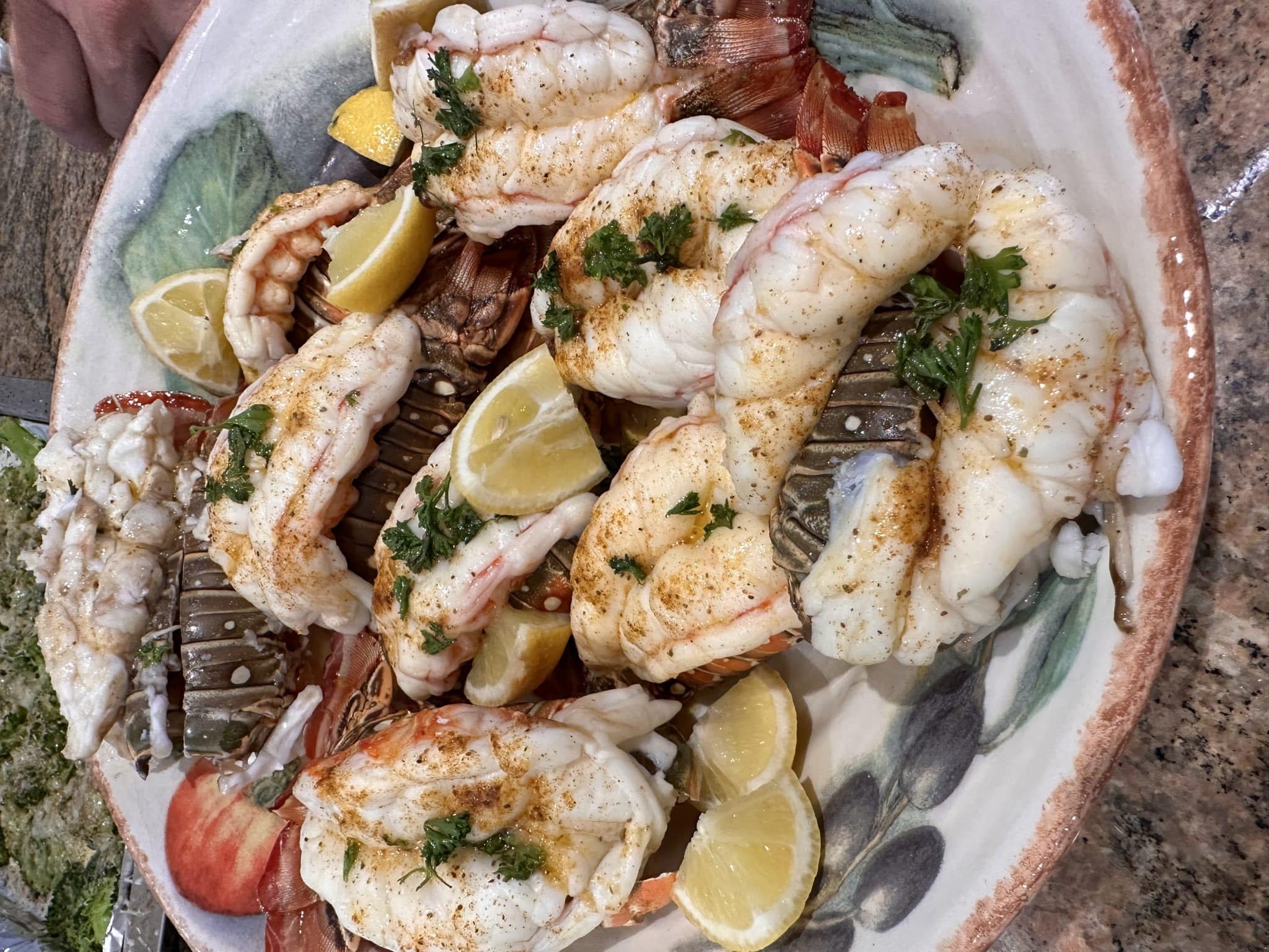 - Place them in a baking dish. Smother the tails with butter, fresh chopped parsley and lemon juice. Dust with Old Bay seasoning. If you like garlic, add freshly chopped garlic, too.