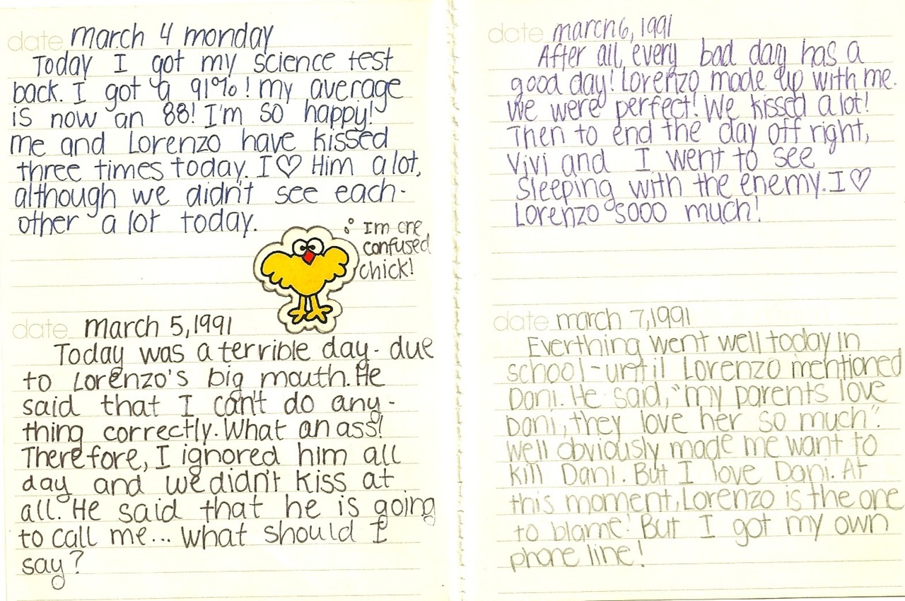 See the third photograph here — a journal entry from yours truly from March 4-7, 1991 — for a visual. It’s pretty ridiculous. Talk about boy crazy. Sheesh.