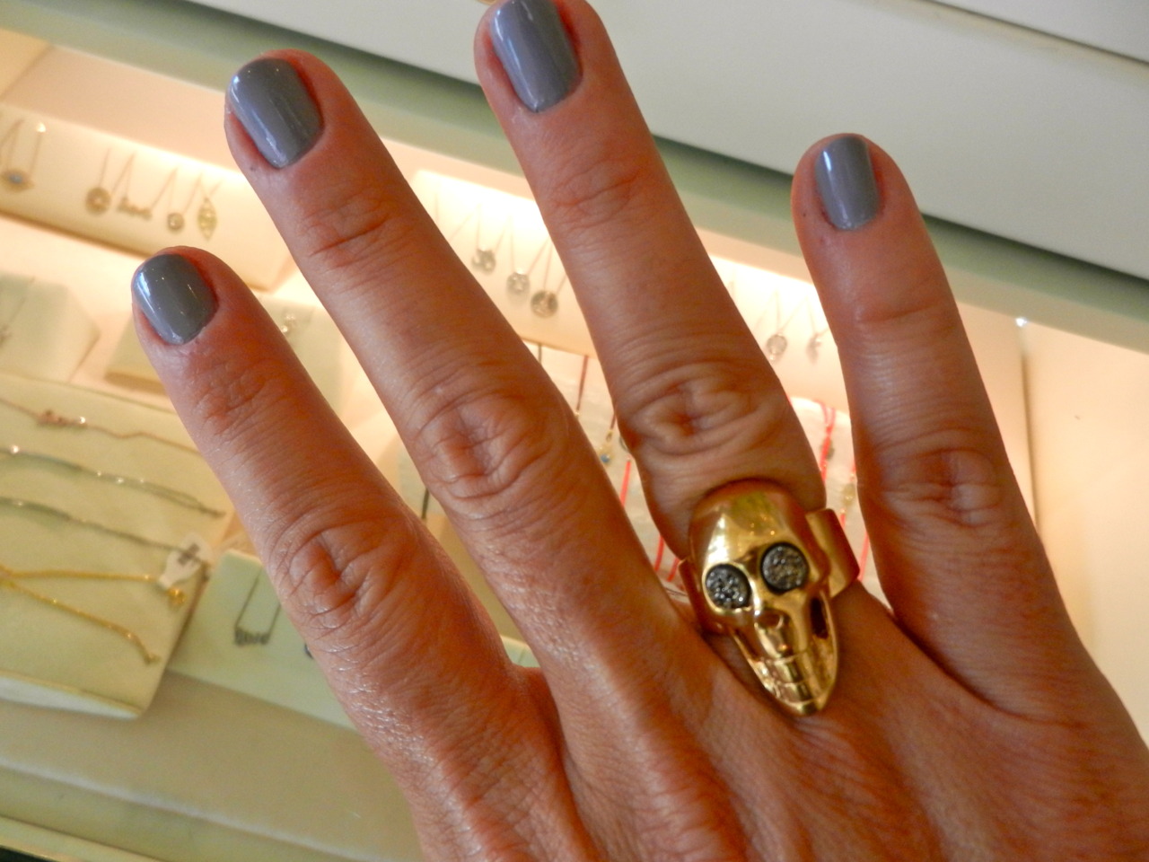 My go-to boutique for accessories that won’t have my checking account seeing zeroes? Harry Winston. Psyche. Almost had you going there, didn’t I? It’s Mia on South Beach. I popped in today after a mani/pedi (Color du jour: Essie’s Cocktail Bling) and spotted this gold-plated Skull Ring with Druzy eyes ($168) and had to make him mine. It has an Alexander McQueen feel to it which I L-O-V-E.