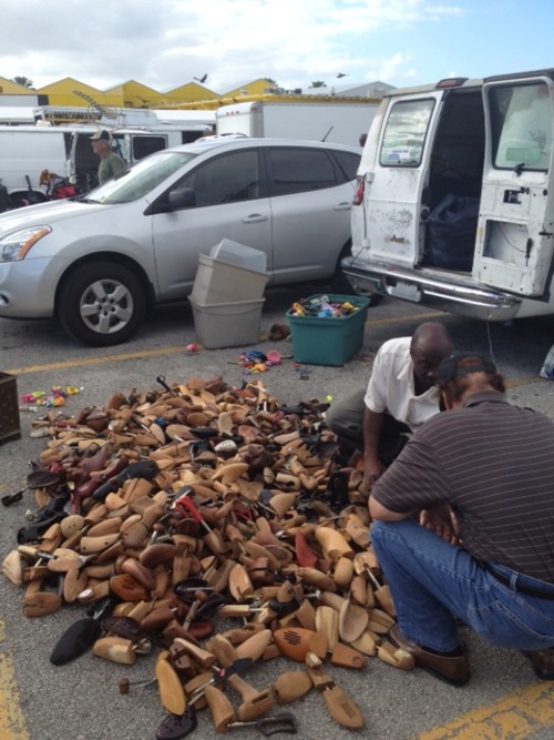Basically, dad’s been schlepping us to flea markets since we were in diapers. “I love the sun! And it’s great exercise! Ooh…did you feel that breeze?” he auto repeats as we walk down each marathon-like aisle. The truth? Homeboy loves to haggle over everything from — gasp — shoetrees (pictured here) to Makita drills. This photo was taken yesterday as he meticulously dissected this staggering pile for pairs for roughly 20 minutes. No lie.